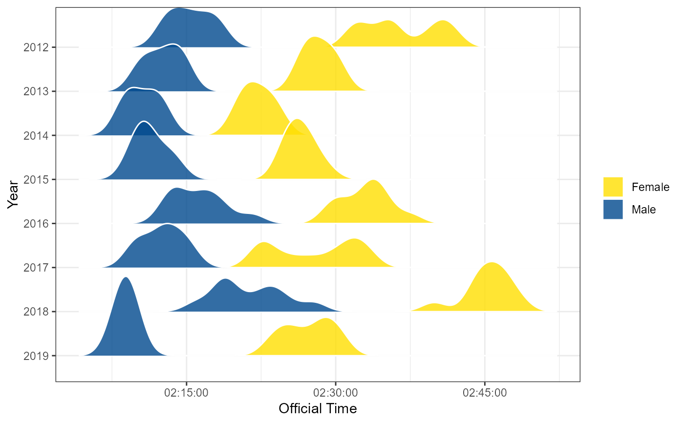 boston_density_ridges.RdThe boston_density_ridges() function uses the results_boston database to plot a density plot (based on the package "ggridges") of finishing times of Boston Marathon from 2009 to 2022. This function needs at least two years to for the graph to plotted properly.
